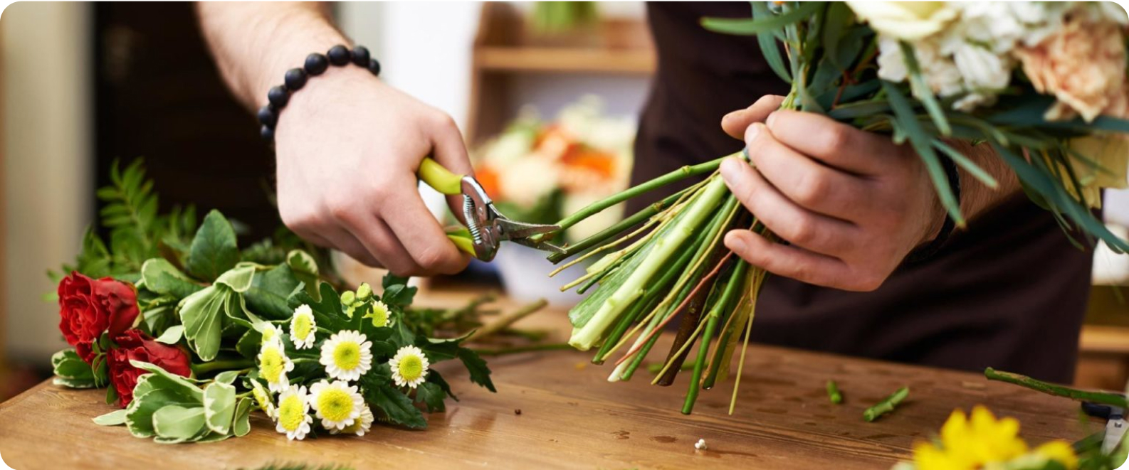 Сразу после получения букета и перед тем, как поставить его в вазу с водой, необходимо подрезать стебли каждого растения на 2 см. Дополнительно нужно убрать листья, которые попадают в воду, а если в букете присутствуют розы, и шипы.